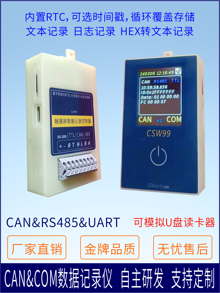 CSW99型CAN&COM数据记录器是一款带触摸彩色显示屏的数据记录器,可将CAN或串口数据记录至SD卡,集成FAT32文件系统,实现高速可靠的数据采集和文件管理。